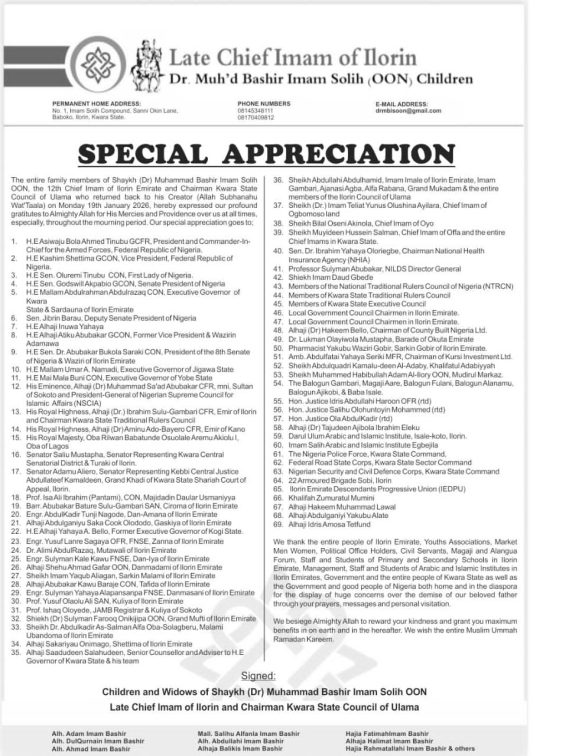 The entire family members of Shaykh (Dr) Muhammad Bashir Imam Solih OON, the 12th Chief Imam of Ilorin Emirate and Chairman Kwara State Council of Ulama who returned back to his Creator (Allah Subhanahu Wat’Taala) on Monday 19th January 2026, hereby expressed our profound gratitutes to Almighty Allah for His Mercies and Providence over us at all times, especially, throughout the mourning period. Our special appreciation goes to;