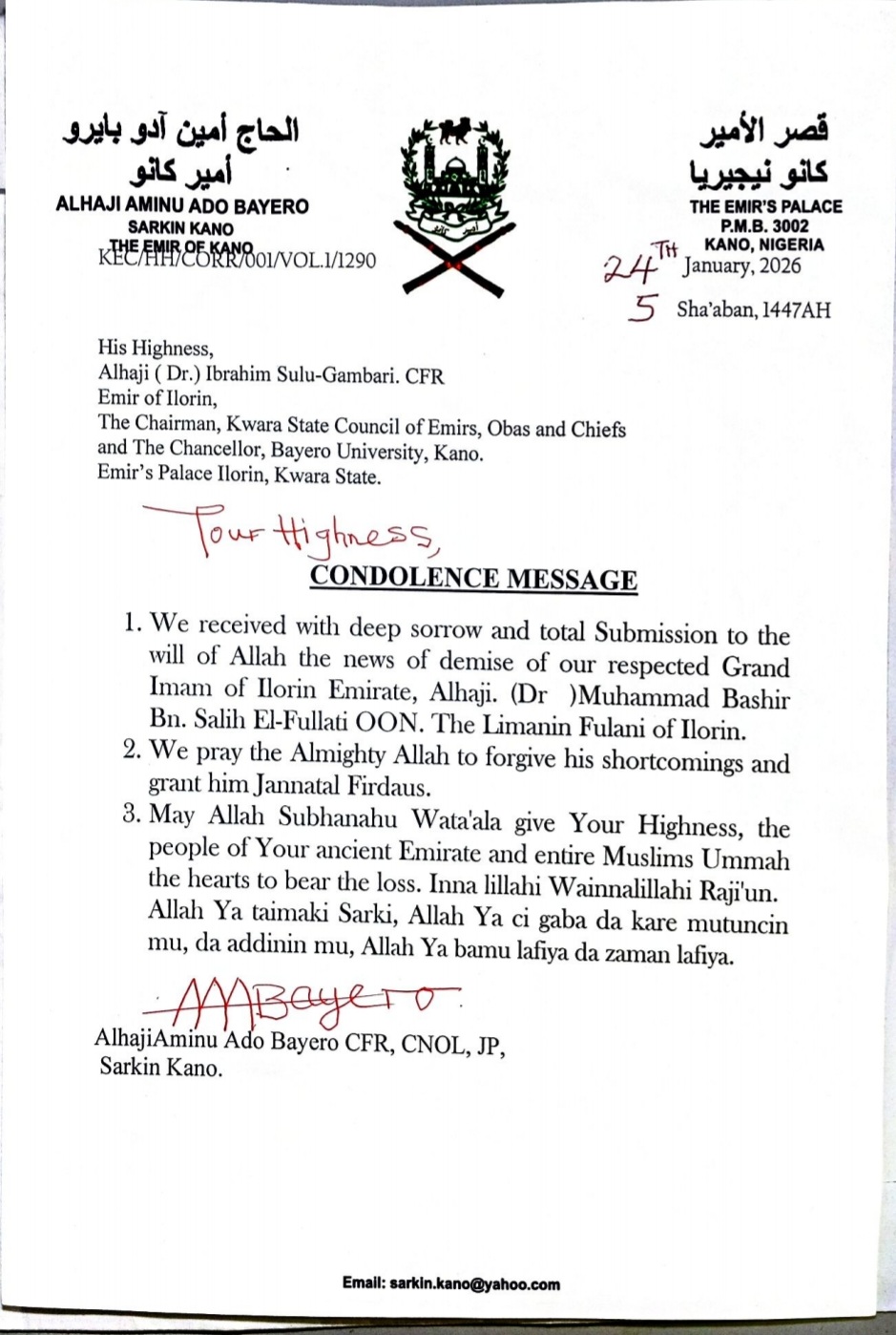 RoyalsTop stories Emir Ado-Bayero greets HRH Ibrahim Sulu-Gambari over Imam Bashir’s death By: Arowona Abdulazeez Date: January 26, 2026 Facebook Comments Box Previous articleAbe Declares Wike APC Leader In RiversNext articleCourt to rule on motion to halt strike as FCTA workers chase Wike from office Arowona Abdulazeez LEAVE A REPLY Cancel reply Comment: Please enter your comment! Name:* Please enter your name here Email:* You have entered an incorrect email address! Please enter your email address here Website: Save my name, email, and website in this browser for the next time I comment. Δ Share post: FacebookTwitterPinterestWhatsApp SubscribeI want inI've read and accept the Privacy Policy. Latest Hajj: Group urges NAHCON to set up c’ittee on animal sacrifice [PHOTOS] Gov. Muftwang’s aide, Moses Nwan bags PhD, donates books to NOUN NANS @45: Barau urges students to back Tinubu for second term Offa Robbery: PDP Accuses Gov. AbdulRazaq of Plot to Re-open Case Against Saraki CBN Data Sparks Alarm Over Rising Debt, Falling Foreign Assets More like thisRelated ADC Holds Convention Despite Court Order, Leadership Crisis Deepens Precious Godwin - April 15, 2026 ABUJA — The African Democratic Congress (ADC) on Tuesday... 80% of Nigerian Trawlers Grounded as Diesel Costs Trigger Fish Shortage, Price Surge Precious Godwin - April 13, 2026 Members of the Nigerian Trawlers Owners Association (NITOA) have... ADC Convention Plans Hit Snag as Abuja Venue Withdraws Approval Precious Godwin - April 14, 2026 The planned national convention of the African Democratic Congress... Adebayo Raises Integrity Concern Over INEC Chair Amid Alleged X Account Controversy Precious Godwin - April 13, 2026 The 2023 presidential candidate of the Social Democratic Party... Retired Police Officers Blast FG Over N1.5m Pension, Demand Exit From Scheme Precious Godwin - April 17, 2026 Retired police officers have raised concerns over what they... Court Grants Bail to Crypto Trader Blord, Bars Foreign Travel Pending Trial Triumphant Kayode - April 17, 2026 The Federal High Court in Abuja has granted bail... [PHOTOS] Gov. Muftwang’s aide, Moses Nwan bags PhD, donates books to NOUN Arowona Abdulazeez - April 18, 2026 Dr Moses Nwan, the Executive Private Secretary to Governor... El-Rufai Ally Says Former Kaduna Governor Preparing 2027 Presidential Bid Oluwatosin Ojeniyi - April 14, 2026 A close ally of former Kaduna State Governor, Nasir...