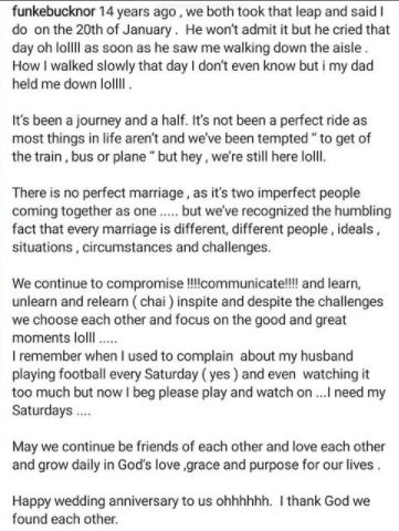 In a post shared on her Instagram page this afternoon, January 22, Funke reflected on their marital life. She said there have been times they were tempted “ to get off the train, bus or plane “ but they have come to the understanding that every marriage is different.