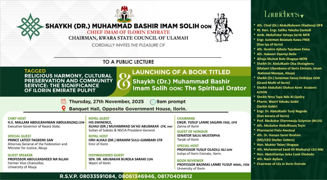 The book launch which is scheduled to hold on Thursday 27th November 2025 at the Banquet Hall, Opposite Government House, Ilorin is the biography of Shaykh (Dr.) Muhammad Bashir Imam Solih OON, revealing his birth, career, emergence and service as the 12th Chief Imam of Ilorin and Chairman Kwara State Council of Ulama.