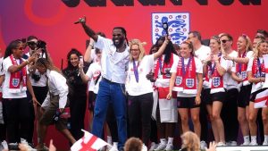 England women’s national team coach, Sarina Wiegman, and Afrobeats’ artist, Burna Boy during the Lionesses’ triumphant homecoming parade at Buckingham Palace after their Euro win…Photo Credit: X | Nuvibbe Prexx